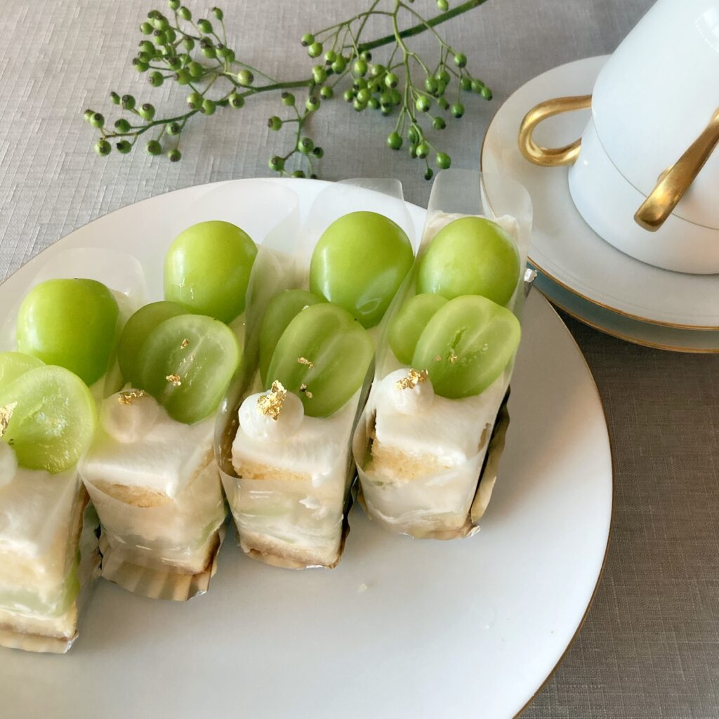 4. 生地に生クリームを塗り、スライスしたマスカットを並べ仕上げる。