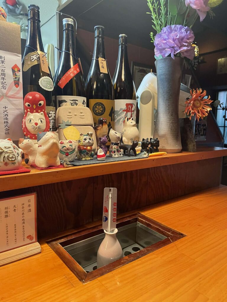 志保さんが女将になってまず決めたのは、「初代のこだわりを絶やさない」ということだった。ほおづきは開店当初から神奈川県内の酒蔵の日本酒を中心に扱ってきた店。その想いを引き継ぐなら——どうせなら神奈川県内の酒蔵を全部揃えたい。志保さんの中でその気持ちは自然に膨らんでいった。そして今、店には県内13蔵の日本酒がずらりと顔を揃える。これからの季節はお燗も良い。カウンターには、お燗器が埋め込まれている。お燗器の湯気がほのかに立ち上るカウンター越しに、女将の歩んできた年月が静かに積み重なっている。