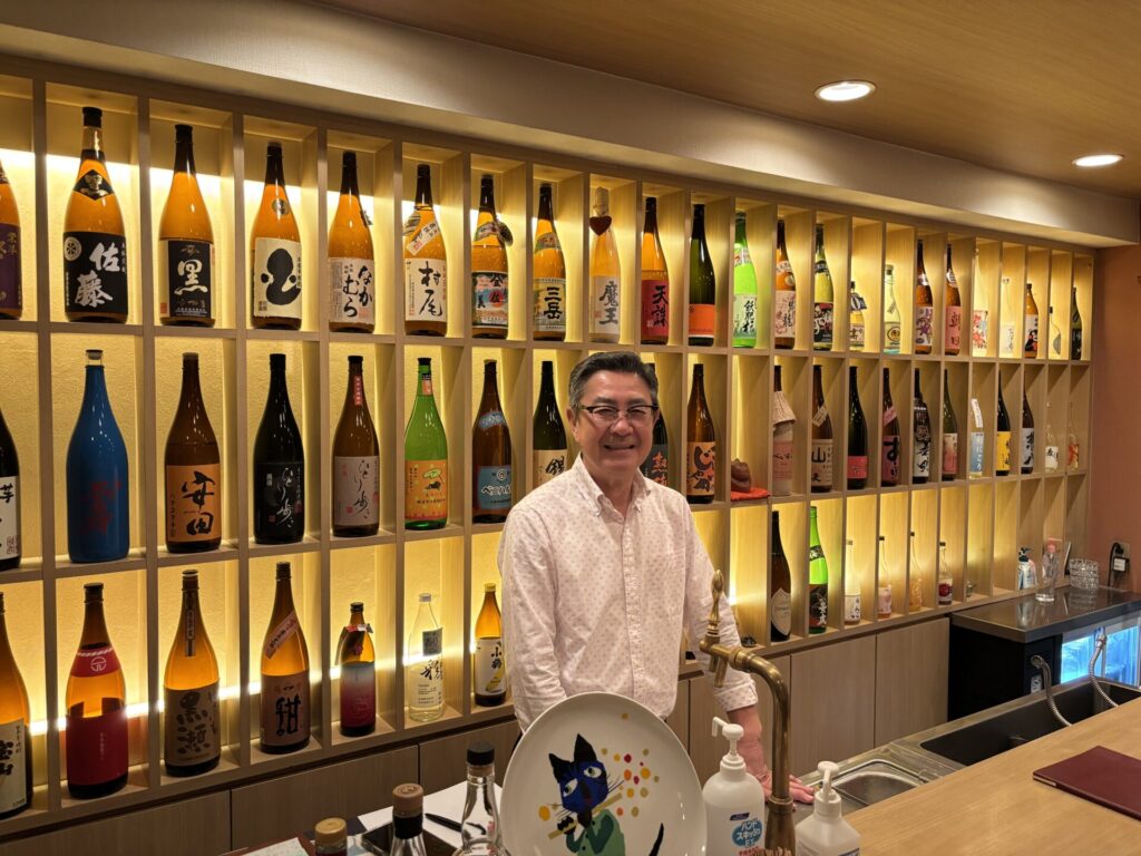 カウンターの後ろの棚にずらり並ぶのは全国から取り寄せた焼酎の一升瓶だ。間接照明に照らされた焼酎が輝き、どれも美味しそうに見える。アミさんは時間を見つけては蔵元を訪ね、造り手の想いを直接聞く。「お酒を提供する以上、誰がどんな気持ちで作っているのかを知りたいんです。」その言葉通り、ここで出される焼酎には、造り手と店の心が通っている。