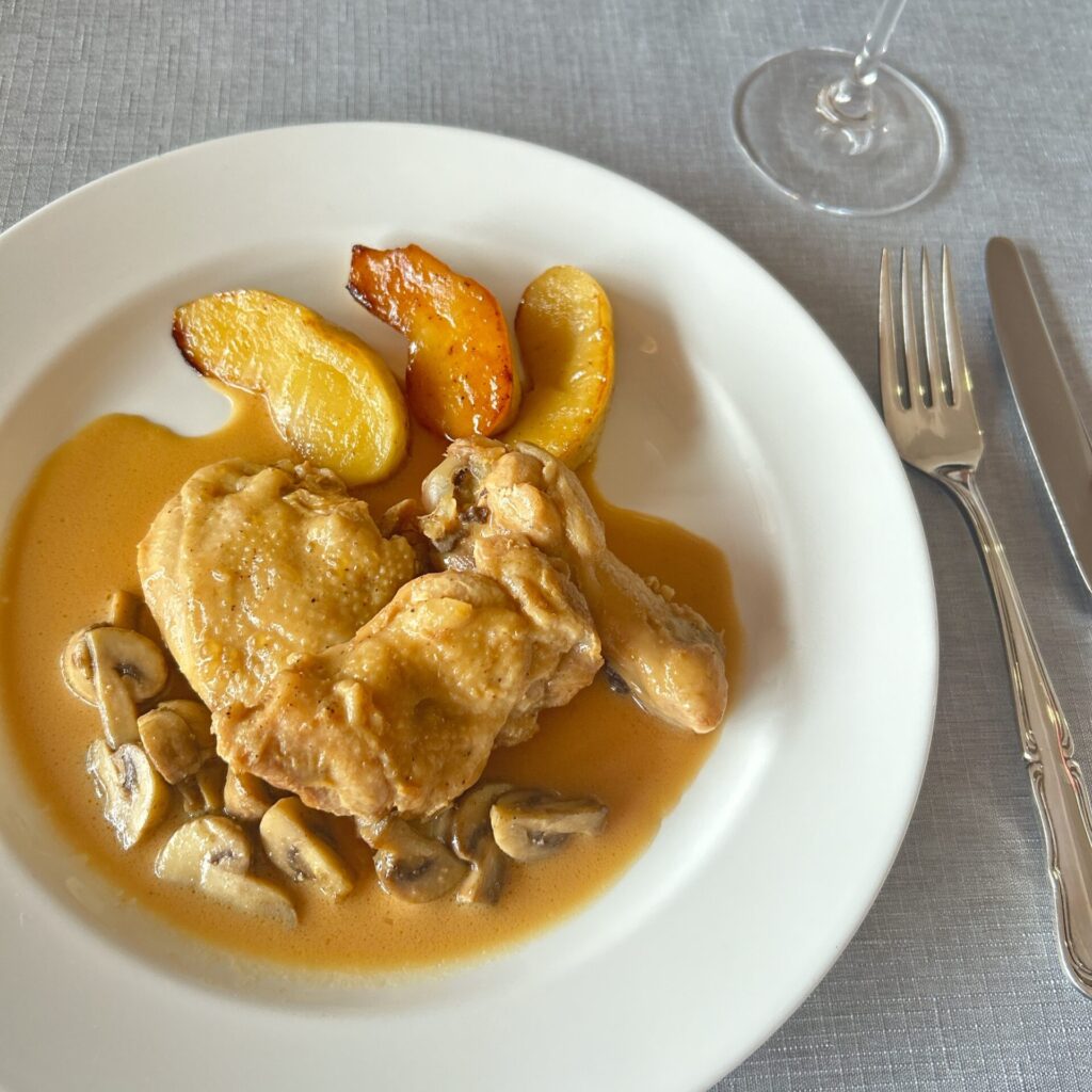 9. お皿に鶏肉、りんご、マッシュルームを盛り付け、ソースをかける。